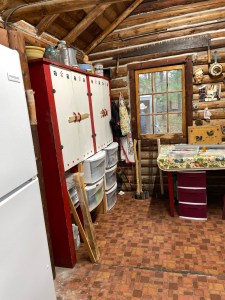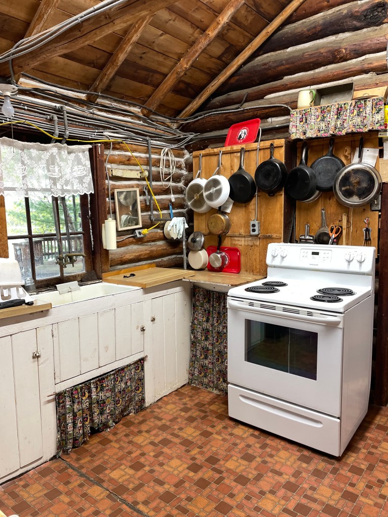 A glimpse at the old kitchen Going into this year, priority one was the kitchen in the original cabin. After obtaining a practically new kitchen for the other cabin a couple years ago for free, expectations were high. That new kitchen clearly outshined the old cabin’s kitchen, leading people to decide that a facelift was due for the old cabin kitchen. Change is never easy and gaining “authorization” to tear out the old kitchen didn’t come without its challenges. Looking like something that Aunt Jemima, herself would have cooked in, the kitchen held many memories of baking bread on the old wood stove, baking pies and frying up bacon and Batchawana fries in one of the ten cast iron frying pans proudly displayed on the cabin walls. But it was time.