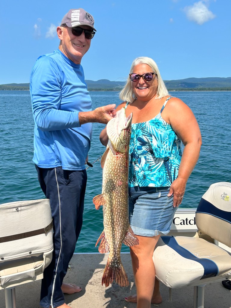 After squatting with family members at the cabin during their vacation weeks, it was finally time for our two weeks up there. Scott’s daughter and husband joined us with their senior dog for a very chill week. She is expecting a little girl in October and I was happy to act as photographer for them for some baby-bump pictures on the beach. Fishing continued to suck and Scott and I both caught cold AGAIN but it was fun and relaxing. The following week had some friends join us for a great, relaxing time. Although not everyone was able to make it up this year, we made lots of great memories. Cooking on the outdoor stove, chilling on the pontoon and story-telling at the bonfire. Two weeks of ideal weather in the mid to upper 70’s, with a great breeze = perfect. Heaven on earth! Even better; I FINALLY caught a fish. Actually, two very nice fish. These two whoppers putting me in the top spot for 2024. Scott caught his first walleye in what he says is 54 years; yet go figure, after returning to camp with the fish supposedly on the stringer, they found that it had released itself. At least he had a witness and a photo to back up his claim. Has the worm turned? I’ll provide an updated fishing report in my next post.