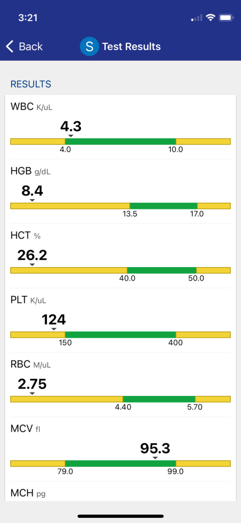 Another important measurement is his hemoglobin. Monday showed him at 8.4. Still below the normal range of 13.5 – 17.0; but much improved. This was another early indicator of problems. Low hemoglobin zaps you of your energy. Levels of less than 7 will get you a blood transfusion. In Scott’s case, we are guessing about 30 of them so far. We are really hoping that October 17th marked the last two units. In my younger days I was a regular blood donor, but I got away from it when it seemed to be such a hassle to fit it into my busy schedule. I think I need to get back in the swing of it now that Scott has done his part in denting the O Negative stockpiles.