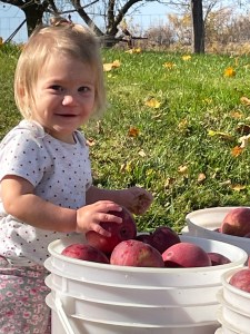 Our grandchild seemed to love being a part of our annual tradition It was also the first year that my grand-daughter was able to participate. Last year she joined us but was just a wee one all wrapped up in her snuggly blankets. This year she came ready to work. Or at least get herself all wet. My son was busy trying to keep her from climbing into the apple washing bucket; the girl loves the water. She’s going to be good help one of these days.