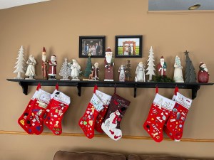 Just some of my Santa Claus figurines – along with our customized stockings – waiting for Santa to come and fill them. -